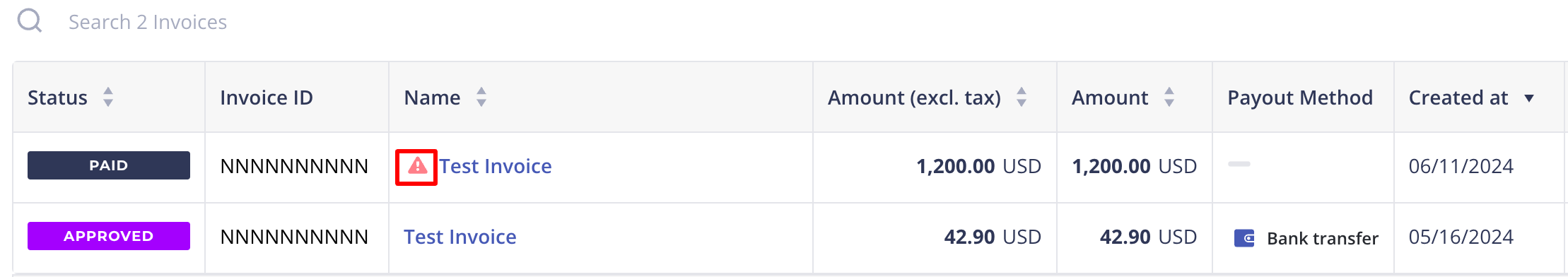 You can quickly identify an invoice that has been reported by the [⚠️] icon that will show up beside the invoice: